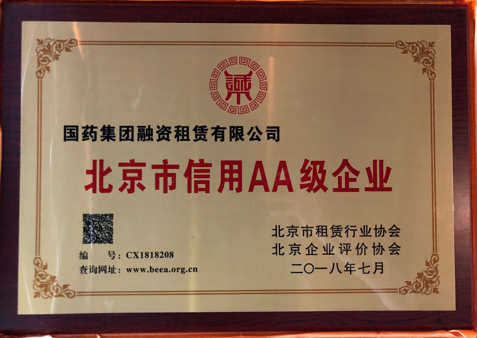 2018年7月15日,經北京市租賃協會推薦、北京市企業信用評價活動秘書處公示,國藥集團融資租賃有限公司獲得“北京市信用AA級企業”稱号。