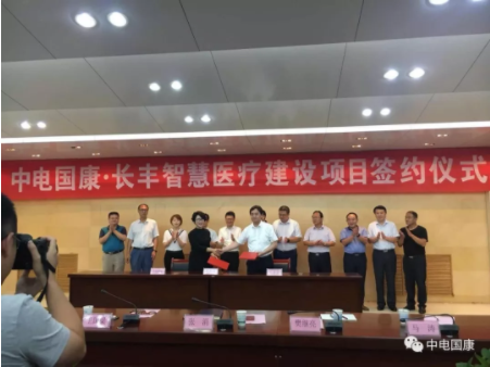 爲響應十九大“鄉村振興”戰略,推進長豐縣鄉村智慧醫療建設與健康信息産業發展,2018年8月16日,長豐縣人民政府與中電國康數據科技有限公司正式簽署戰略合作協議。長豐縣副縣長石磊介紹長豐縣實際情況,並代表長豐縣縣政府與中電國康代表張涓總裁簽署戰略合作協議。長豐縣委書記許華、縣長黃韡、國藥租賃總裁王國梁、安徽信投總裁助理毛媛媛等領導共同見證。