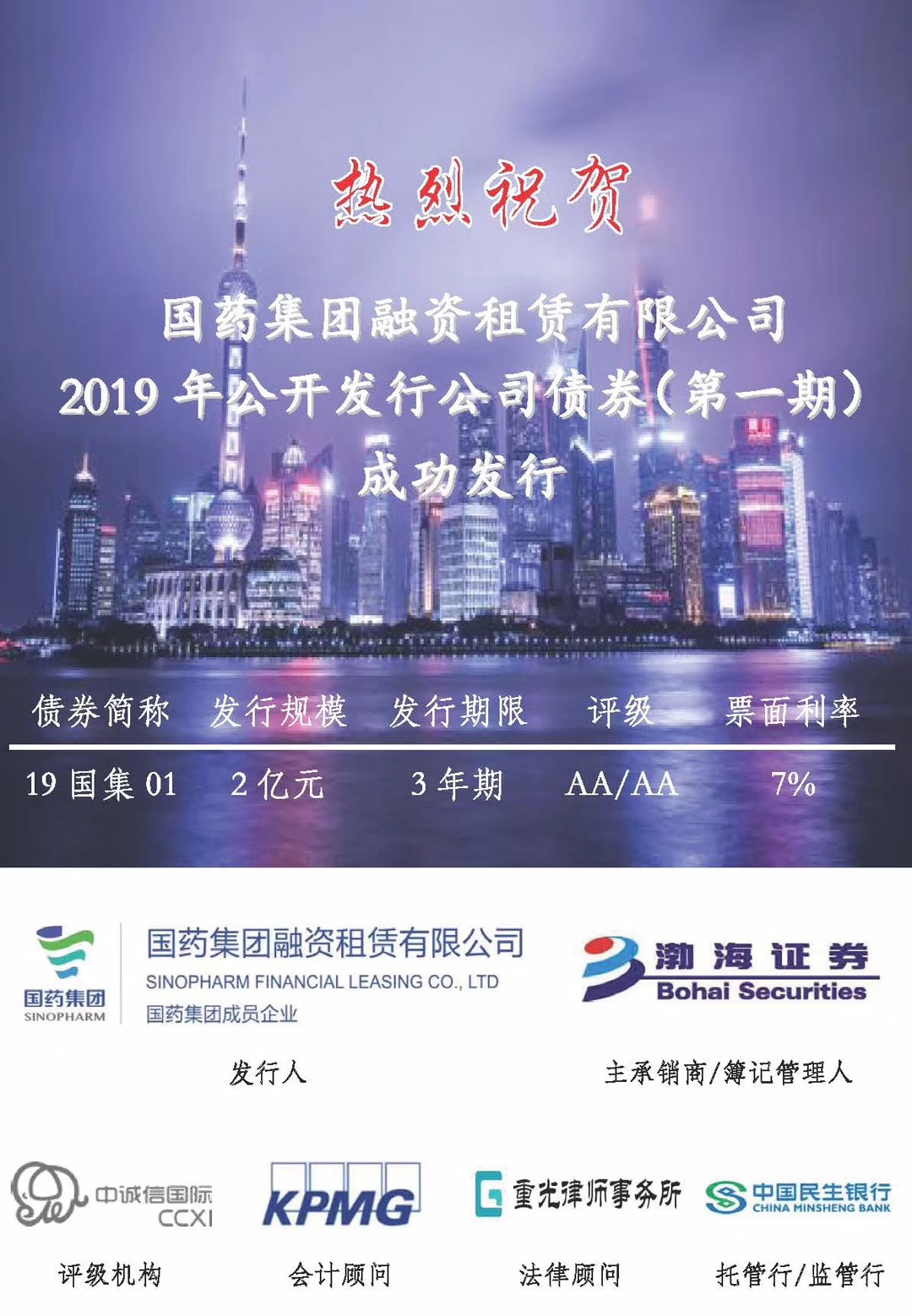 熱烈祝賀國藥集團融資租賃有限公司2019年公開發行公司債券(第一期)於8月29日成功簿記發行,發行總額共計2億元。
