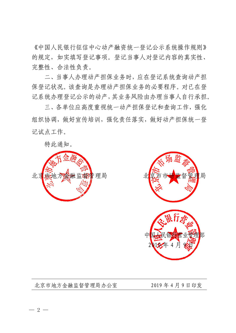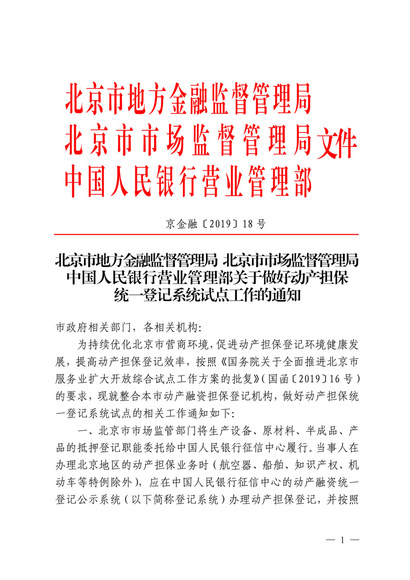 根據北京市地方金融監督管理局、北京市市場監督管理局、中國人民銀行營業管理部《關於做好動産擔保統一登記系統試點工作的通知》(京金融[2019]18号),北京市決定開展動産擔保統一登記系統試點工作。