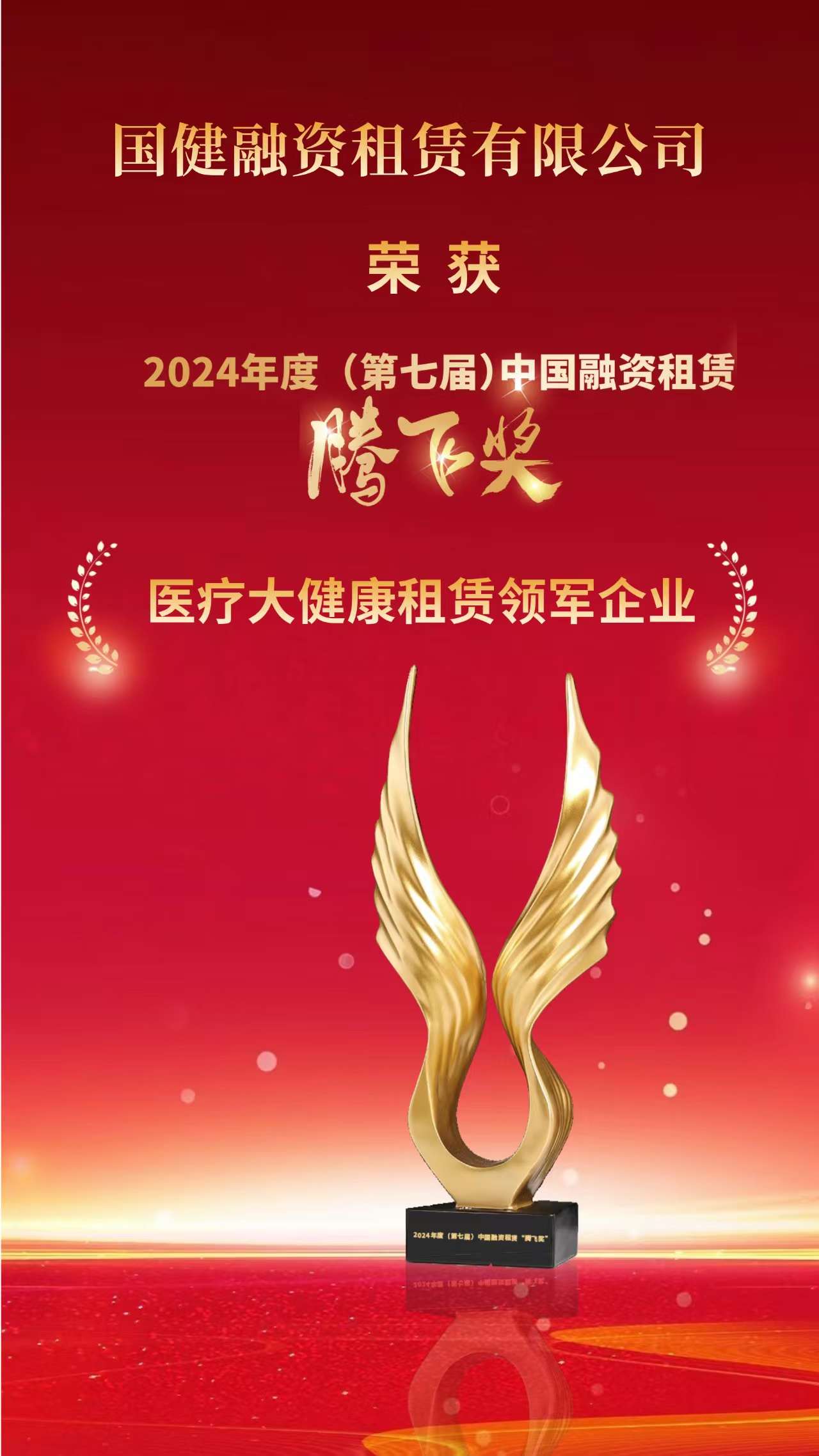 12月4日,2024(第十一屆)全球租賃業競争力論壇·峰會在天津舉行,本屆峰會以“發力‘兩新’租賃,助力先進産能”爲主題,國健租賃憑借在醫療大健康領域的卓越表現,榮獲2024年度(第七屆)中國融資租賃“騰飛獎”“醫療大健康租賃領軍企業”獎。