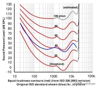 紅(hóng)線是Phon值曲線(Phon是響度Loudness的單(dān)位),