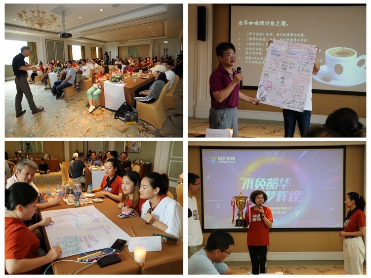 最後的複盤,我們引進瞭世界咖啡-創造集體智慧的溝通分享方法,設置五個不同話題的咖啡館,除館主以外的其他人員自發選擇,參與每個話題的讨論。大家彼此間充分交流思想、表達觀點,最終用集體的智慧凝練出兩天的收獲與心得,並一同展望國藥租賃五年後的輝煌未來。